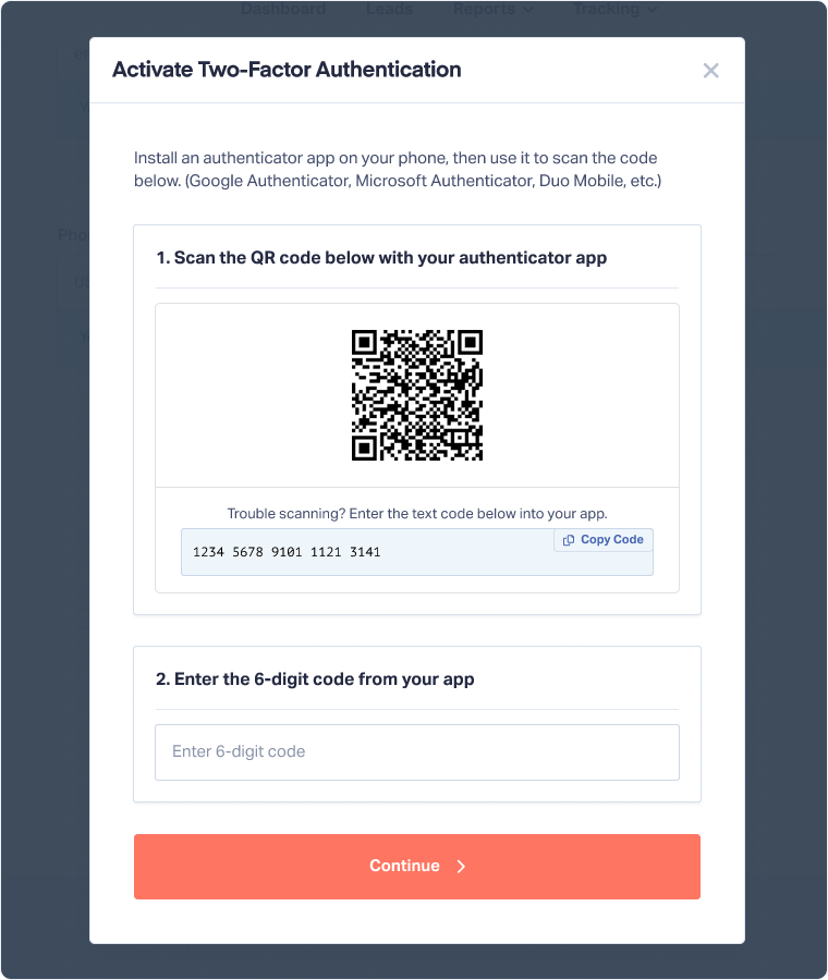 When you log in to your WhatConverts account for the first time, you’ll be prompted to set up Two-Factor Authentication using an authenticator app.