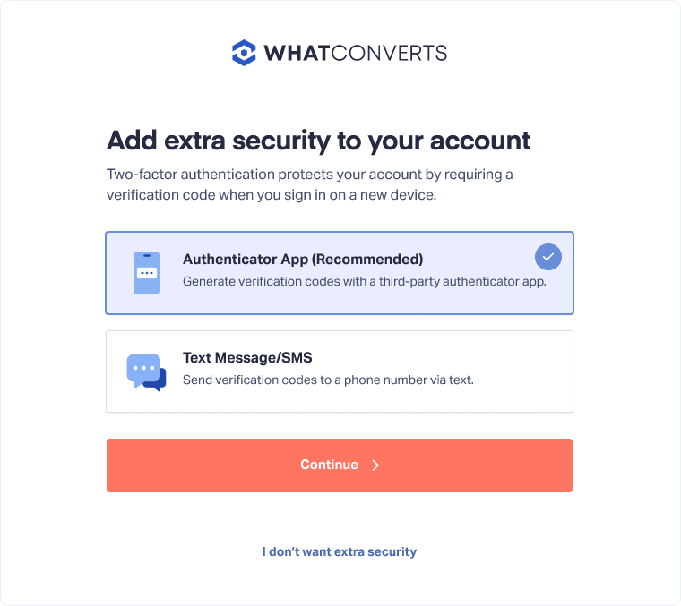 Two-Factor Authentication (2FA) adds an extra layer of security to your WhatConverts account by requiring a verification code in addition to your password.