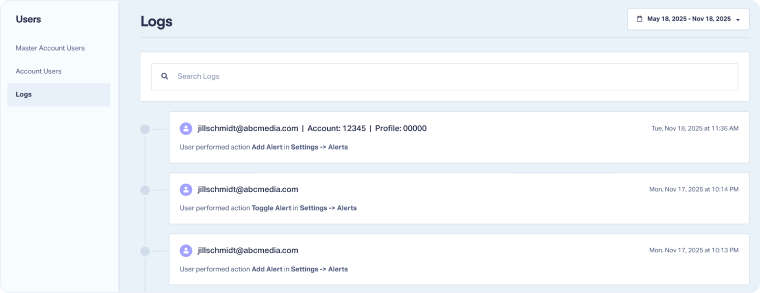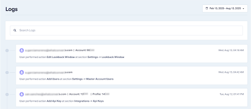 Note: Use the search bar to filter logs by action, section, Master Account ID, Account ID, or Profile ID. You can also use the time selector to focus on a specific time period.