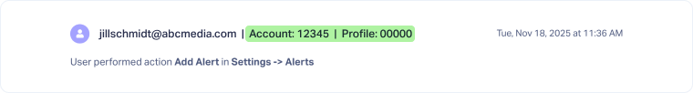 - Account Information: Shows the account and profile, if applicable, tied to the action.